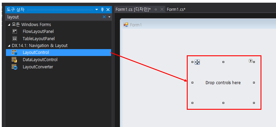 1. Form 생성 후 LayoutControl 을 Form위에 올린다.