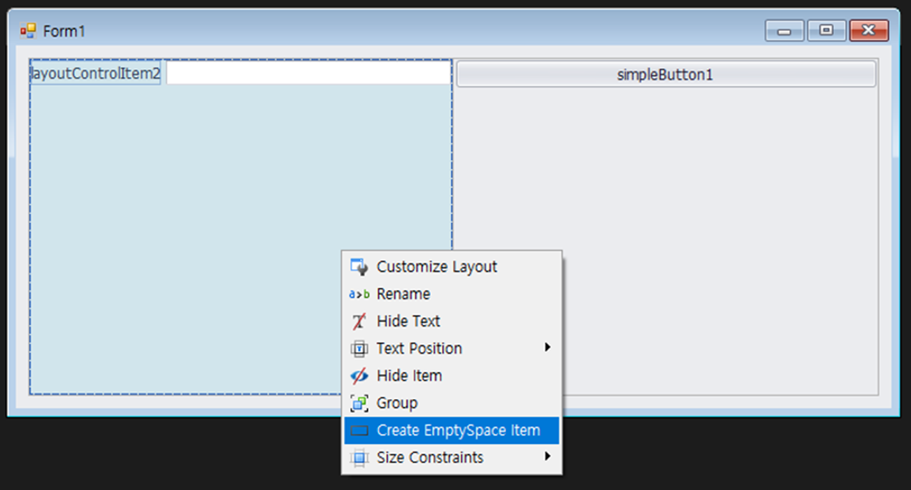 Devexpress에서는 LayoutControl를 사용해서 컨트롤을 자동정렬할 수 있다. 자동정렬을 사용하지 않을 경우 UI를 디자인하는데 상당한 시간이 소요된다. Form에 LayoutControl을 올리고 그 이후에 button, textedit 등을 드래그, 드랍으로 옮기면 간편하게 원하는대로 디자인할 수 있다.
