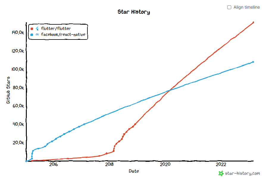 github에서 좋아요 기능을 하는 star에서도 2020년 이후로 flutter가 react native를 추월하기 시작했다. 앞으로 무엇이 더 개발자들에게 선택을 받을지 모르겠지만 현재 추세로는 flutter를 선택하는게 좋지 않을까 생각한다.