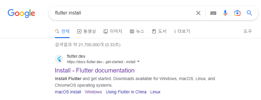구글에서 flutter install을 치면 가장 상단에 나오는 사이트에 접속한다.
