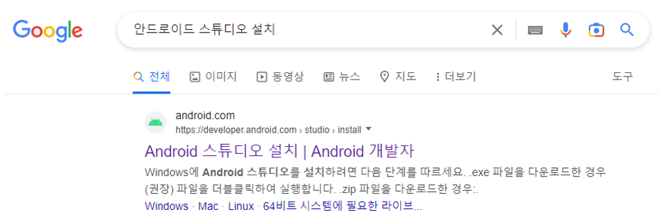 "구글에서 안드로이드 스튜디오 설치" 라고 검색하면 나오는 아래 사이트에 접속한다.