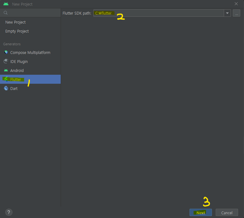 New Project 팝업에서 Flutter 선택 -> Flutter SDK path에 flutter sdk가 위치한 경로 지정 -> Next 버튼 눌러서 다음 화면으로 이동.
