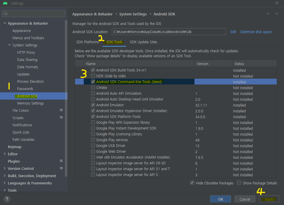 Android SDK -> SDK Tools -> Android SDK Command-line Tools -> Apply 선택하여 설치